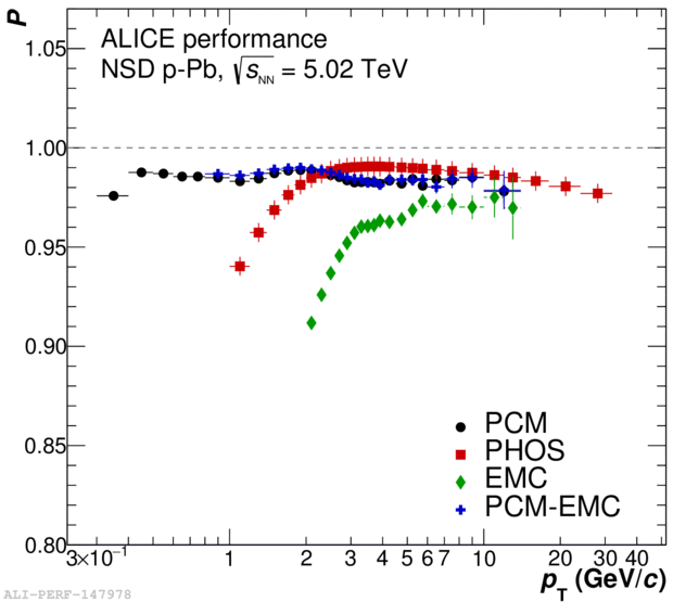 Purity of the inclusive photon sample in NSD p-Pb collisions at 5 TeV for different reconstruction techniques.