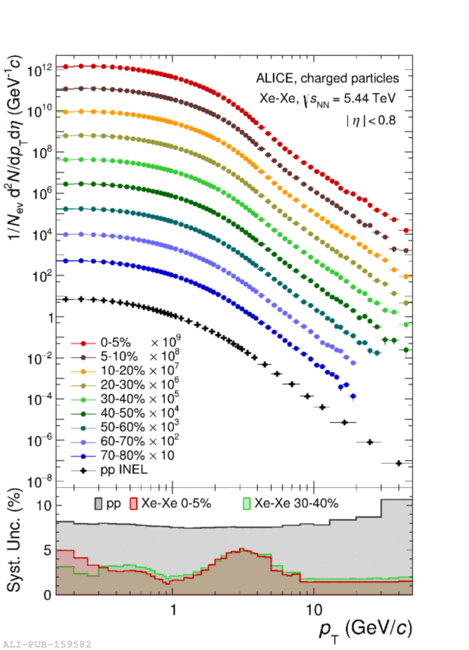 interpolated pp reference spectrum at sqrt(s) = 5.44 Tev (top panel) and systematic uncertainties (bottom panel).