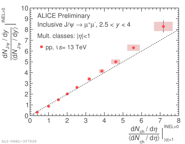 J/ψ yield dNJ/ψ /dy at forward-rapidity (J/ψ →mu+mu−, 2.5 < y <4.0) as a function of the charged particle multiplicity densities at mid-rapidity dNch/dη for pp collisions at \sqrt{s} = 13 TeV. Both values are normalized by the corresponding value for minimum bias pp collisions (dNJ/ψ /dy, dNch/dη). The error bars represent the statistical uncertainty on the J/ψ yields, while the point-by-point systematic uncertainties on the J/ψ yield is depicted as boxes. The dotted linear line (y=x) is drawn to see deviation from non-linearity of the points.