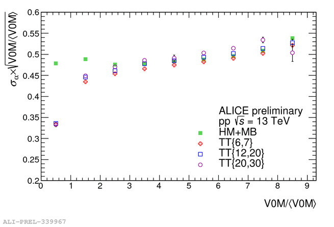 Scaled width of the V0 asymmetry distribution as a function of V0M/<V0M> in pp 13 TeV Distributions are shown for combined minimum bias events and high multiplicity events (green), and for combined minimum bias and high multiplicity events containing TT{6,7}, TT{12,20} and T{20,30}. Widths of the asymmetry distributions were obtained from gaussian fits.