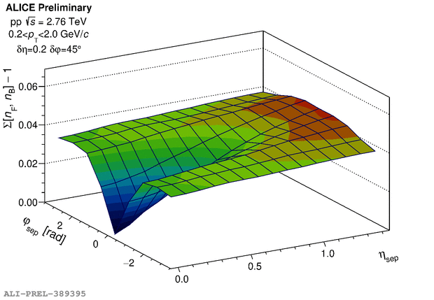 Σ[nF, nB] − 1 measured for pp collisions at √s = 2.76 TeV as a function of distance between the centers of 2 windows of size δη=0.2 δφ=45° separated in pseudorapidity (ηsep) and azimuth (φsep)
