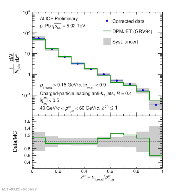 Unfolded and UE subtracted $z^{\rm ch}$ distribution for leading jet $p_{\rm T,jet}^{\rm ch}$ = 40-60 GeV/$c$ in p-Pb collisions at 5.02 TeV. The green curve shows the DPMJET [1] (GRV94) prediction.