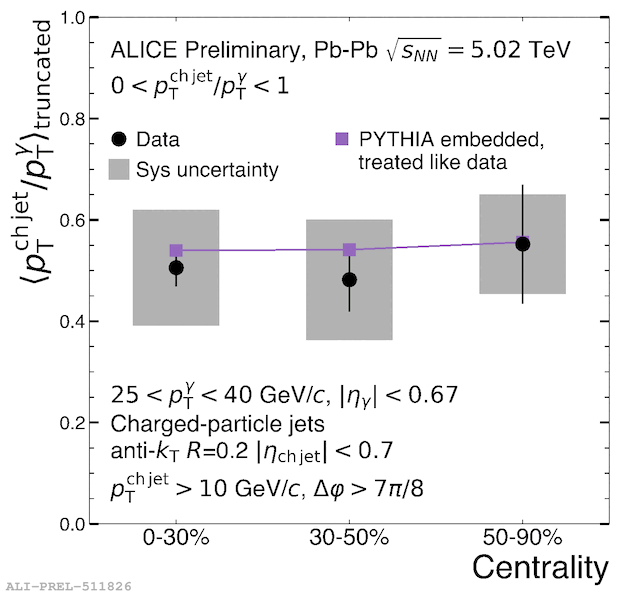 Truncated mean (between 0 and 1) of momentum imbalance between isolated photons and jets in 5.02 TeV Pb-Pb collisions, also compared with embedded gamma-jet and dijet PYTHIA treated like data
