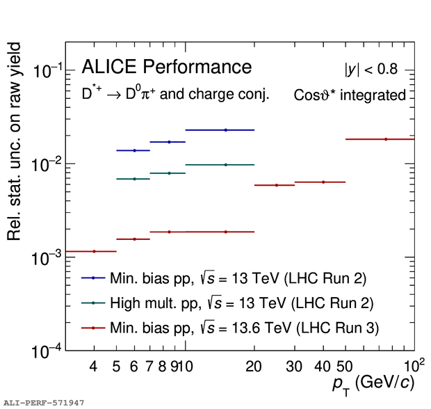 Comparison of relative statistical uncertainty on raw yield between run2 and run3 in pp collisions at $\sqrt{s}=13.6\ \mathrm{TeV}/c$, reconstructed in the $\mathrm{D}^{*} \rightarrow\mathrm{D}^{0}\pi^+ \rightarrow \mathrm{K}^-\pi^+\pi^+$ decay channel. The raw yield was extracted for $cos\theta^{*}$ integrated with bin counting method at range $0.14<0.165\ \mathrm{GeV}/c^2$.