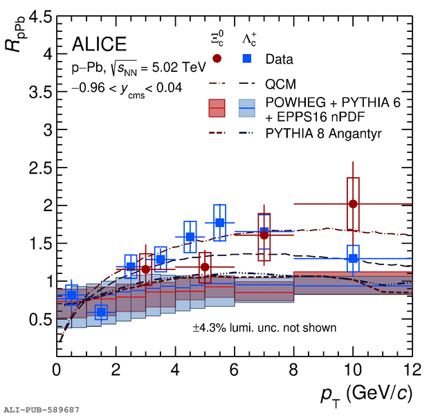 Nuclear modification factor \RpPb of prompt \xicz baryons in \pPb collisions at \fivenn as a function of \pt compared to the \RpPb of \lambdac baryons~. The measured \RpPb is also compared to POWHEG+PYTHIA~6 with EPPS16 simulations, to PYTHIA~8 Angantyr calculations~, and to QCM predictions. The statistical uncertainties are shown as vertical bars and the systematic uncertainties are shown as boxes. The uncertainties on the POWHEG calculation are due to the choice of the pQCD scales as described in the text.