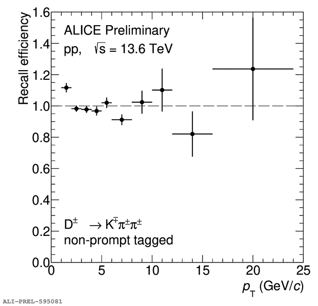 Recall efficiency for non-prompt $\mathrm{D^\pm}$ mesons estimated as the ratio between the yields of charm hadrons from a triggered dataset, and the one extracted after applying the same selection criteria using a minimum-bias data sample.
