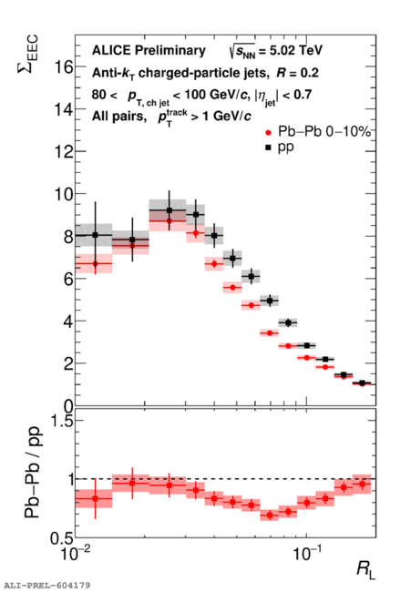 EEC as function of RL for PbPb and pp. Jet pT range is 80-100 GeV