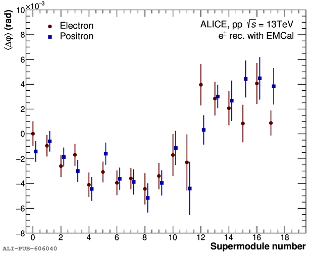 Mean differences between the position in $\eta$ (left) and $\varphi$ (right) of clusters and electron tracks propagated to the \gls{EMCal} / \gls{DCal} as function of the \gls{SM} number. The colors represent electrons (red) and positrons (blue).