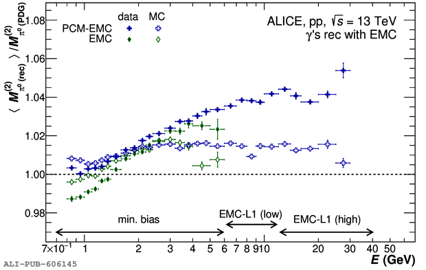Left: Mass positions for \gls{PCM-EMC}(blue) and \gls{EMC} (green) after applying the nonlinearity correction obtained from \Sec{sec:TBNonLin} \Figure{fig:5-TB-EnergyNonLinearity}. The mass positions are normalized to the neutral pion rest mass. In the case of \gls{PCM-EMC} the data points represent the squared mass position. Right: Ratio of mass positions in data and \gls{MC} for both techniques with their corresponding fits according to \Eq{eq:convcalo}.