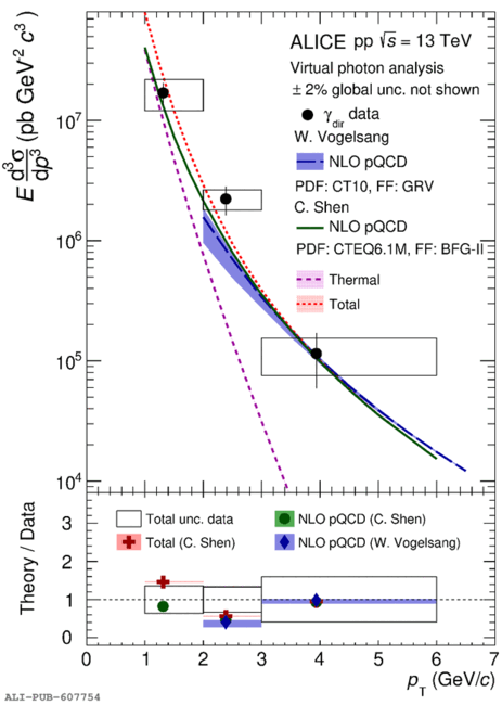 Direct-photon cross section (left) and invariant differential yield (right) as a function of \pt in INEL and HM pp collisions, respectively. Statistical and systematic uncertainties of the data are displayed as vertical bars and boxes, respectively. Global luminosity uncertainty of 2\% is not shown in the Figure. The results in INEL pp collisions are compared to theoretical calculations from~ and~. The results from HM pp data are compared to theoretical calculations for INEL pp collisions scaled by an empirical factor of 3.4--6.6 (for Shen's calculations) and of 7 (for Vogelsang's model), see text for details. The uncertainty for Shen's pQCD calculations (green band) comes from the variation of the scaling factor, whereas the uncertainty of Vogelsang's pQCD results (blue band) is the original model uncertainty scaled by factor 7. The data points are plotted and the ratios are evaluated at the \pt values determined according to the Lafferty--Wyatt prescription~, with the corresponding uncertainties being smaller than the marker size.
