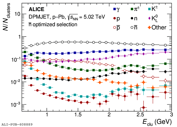 Fraction of different types of particles which produce clusters in PHOS before (left) and after the application of a default set of selections (right) as a function of cluster energy in \ppb collisions simulated with the DPMJET 3.0-5~ event generator.
