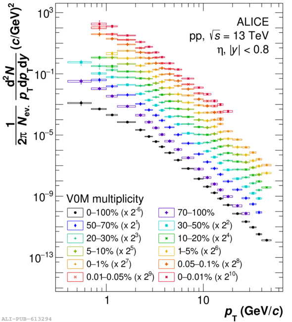 Invariant differential yields of \piz (left) and \et mesons (right) in each selected multiplicity class as defined in \Tab{tab:multClass} and also for the inclusive measurement (0-100\%). The spectra are scaled for better visibility.