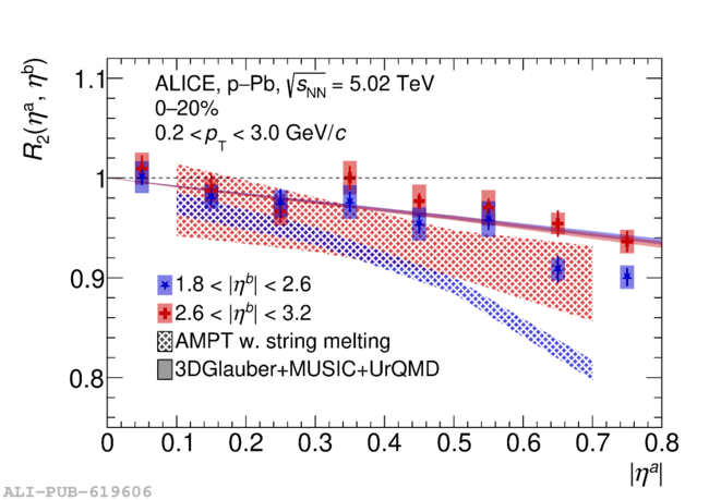 Results for $R_{2}(\eta^{\rm a}, \eta^{\rm b})$ in p--Pb collisions at $\snn$ = 5.02 TeV as a function of $|\eta^{\rm a}|$ with $1.8|\eta^{\rm b}|2.6$ (blue stars) and $2.6|\eta^{\rm b}|3.2$ (red crosses). Statistical (systematic) uncertainties are represented by vertical bars (filled boxes). Calculations from AMPT with string melting and 3DGlauber+MUSIC+UrQMD are shown as textured and plain bands, respectively.