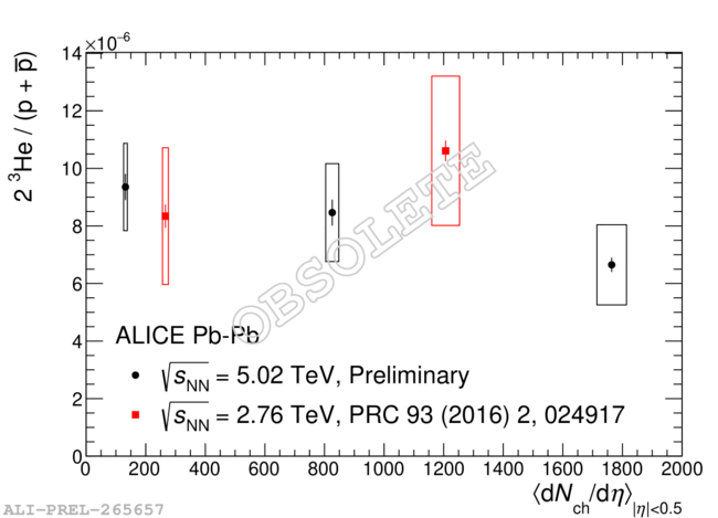$^{3}$He over proton ratio as a function of charged particle multiplicity in Pb-Pb collisions. The red points refer to the pubblished ALICE analysis in Pb-Pb at $\sqrt{s_{\mathrm{NN}}}=2.76$ TeV.
