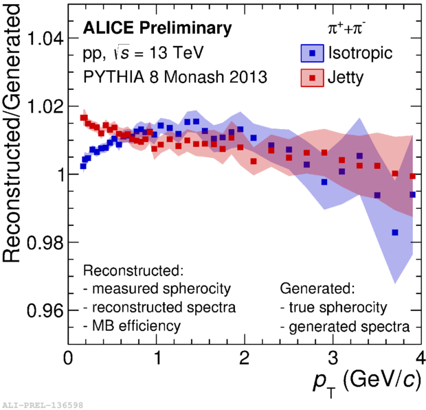 Comparison of reconstructed $\pi$ spectra, corrected by minimum bias efficiency, to generated spectra. Reconstructed spectra was obtained from events selected with reconstructed spherocity, while generated spectra -- from events selected by generated spherocity.