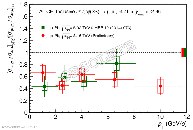 Comparison between the double ratio (Psi(2S)/Jpsi)_{pA}/(Psi(2S)/Jpsi)_{pp} vs pTin Pb-p at 8.16 TeV and at 5.02 TeV. The grey box is the common uncertainty between 8.16 and 5.02 TeV pA results. Plots refer to backward-y