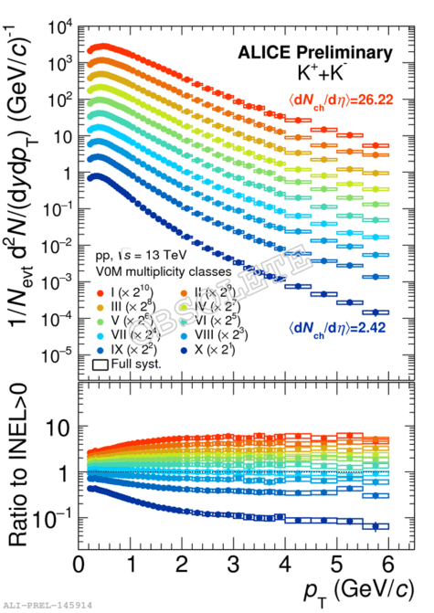 Top panel: Spectra in different V0M multiplicity class, Bottom Panel: Ratio of V0M class to MB (INEL>0)