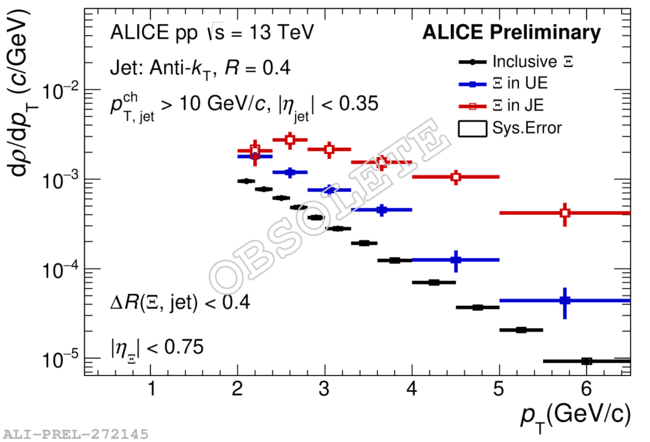 The density of Xi produced in jets with jet R=0.4, and Matching R=0.4. The Xi in UE is the Xi from underlying event. The Xi in JE means the Xi in jet