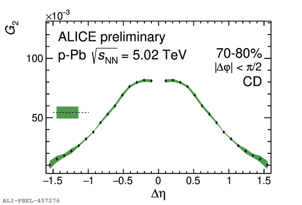 Vertical bars (mostly smaller than the marker size) and shaded band represent statistical and systematic uncertainties, respectively. The systematic uncertainty on the long-range mean correlator strength is represented as a horizontal short shaded band at the left of the plot. Under-corrected correlator value at $\Delta\eta = 0$ is not shown.