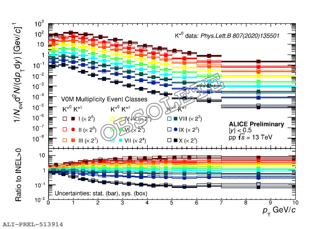 K$^{*\pm}$ and K$^{*0}$ $p$\textsubscript{T} spectra in pp collisions at $\sqrt{s} =$ 13 TeV for different multiplicity classes studied, scaled by the indicated factors. Lower panel: ratios of the $p$\textsubscript{T} spectra to the INEL$>$0 spectrum.