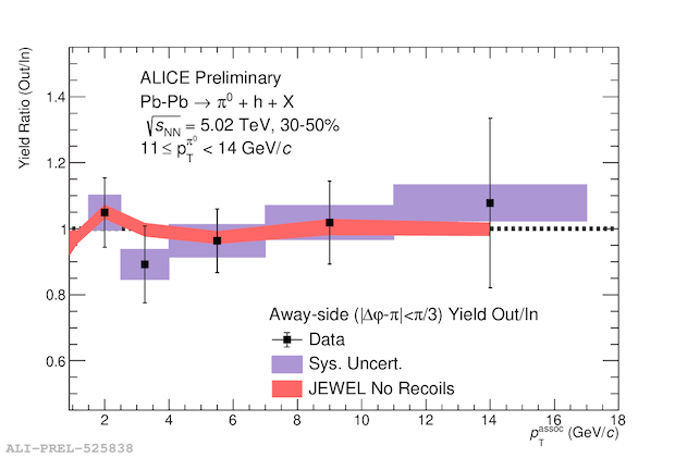 Ratio of correlated away-side (|Δφ-π| < π/3) between out-of-plane (|φ-Ψ2|>π/3) and in-plane (|φ-Ψ2|<π/6) π0 triggers in the pT range 11-14 GeV/c, in EMCal-Gamma triggered events in the 30-50% centrality range. JEWEL (without recoils) model comparison is plotted along side for the same centrality range, with initial temperature parameter 590 MeV.