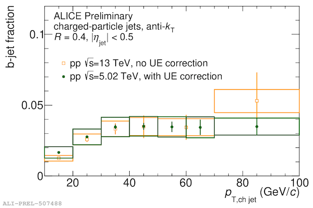 Comparison of the fraction of b jets over inclusive jets for pp collisions at 5.02 TeV and 13 TeV.