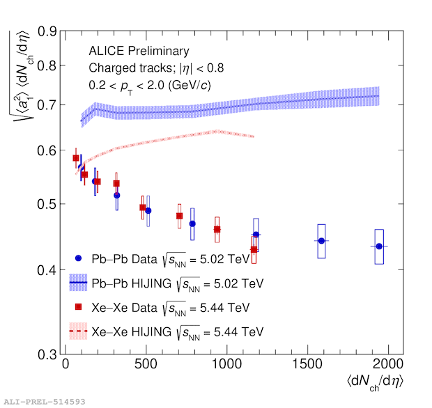 The first longitudinal coefficient a1 as a function of <dNch/deta> in Pb-Pb collisions at √sNN = 5.02 TeV(LHC18r, LHC18q) and Xe-Xe collisions at √sNN = 5.44 TeV (LHC17n), compared between data and MC HIJING. a1 was computed EbyE using Legendre polynomial decomposition. For Pb-Pb data, both periods with different polarities LHC18q and LHC18r were analyzed and merged. The values used for <dNch/deta> are published values from ALICE (arXiv:1512.06104; arXiv:1805.04432). Statistical and systematic uncertainties are included. Systematic errors are averaged along centrality. Systematic errors in Xe-Xe data are assigned from Pb-Pb data systematic errors.