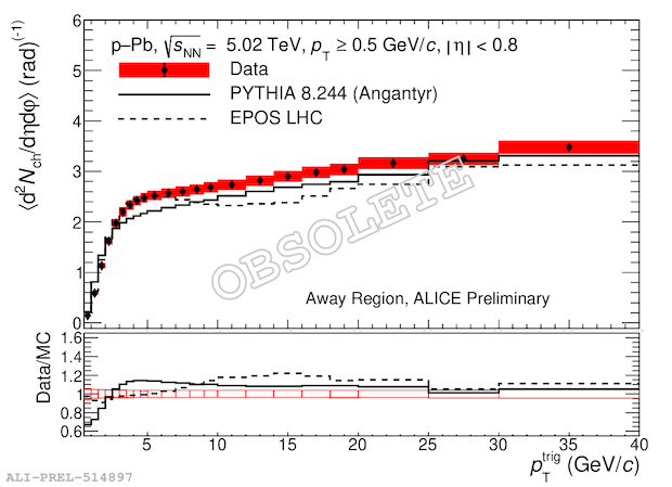 The charged-particle number density as a function of $p_{\rm T}^{\rm trig}$ in pPb collisions in away region with transverse momentum threshold $p_{\rm T} > 0.5 $ GeV/$c$. The shaded area and the error bars around the data points represent the systematic and statistical uncertainties, respectively. Data are compared with PYTHIA 8/Angantyr (solid line) and EPOS LHC (dashed line) predictions. The data-to-model ratios are displayed