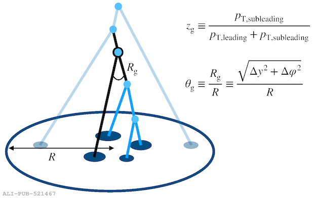 Graphical representation of the angularly ordered Cambridge-Aachen reclustering of jet constituentsand subsequent Soft Drop grooming procedure~,with the identified splitting denoted in black and the splittings that were groomed away in light blue.