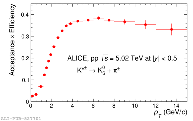 Acceptance$\times$Efficiency as a function of \pT~for \simplekstarch~mesons, detected by their decay to\kshort~+~\ppm, with \kshort~reconstructed by their decay to \pip~+~\pim. The \kshort~$\rightarrow$~\pip~+~\pim branching ratio is included in the efficiency estimation. Statistical uncertainties are shown with error bars.