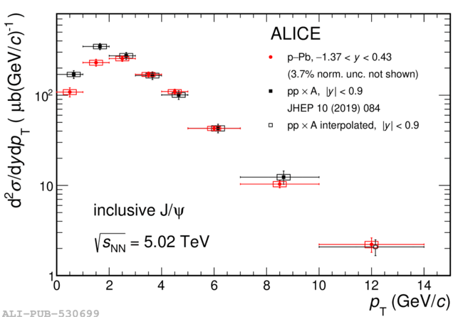 The \pt-differential inclusive \PJpsi\ cross section per unit of rapidity, $\textup{d}^2\sigma_{\rm incl.\,\PJpsi}/\textup{d}y\textup{d}p_{\rm T}$, as a function of \pt in p--Pb collisions (red circles) compared with the analogous cross section measured in pp collisions at $\sqrt{s}=5.02$~TeV~ multiplied by the Pb mass number (${\rm A}=208$) (black closed squares, shifted horizontally by 150 MeV/$c$ for better visibility). The vertical error bar and the box on top of each point represent the statistical and systematic uncertainty, respectively. The open square symbol (also shifted by 150 MeV/$c$) shows the value for pp collisions in the \pt interval 10-14~GeV/$c$, which was obtained with the interpolation procedure. In this case the error bar corresponds to the total uncertainty.