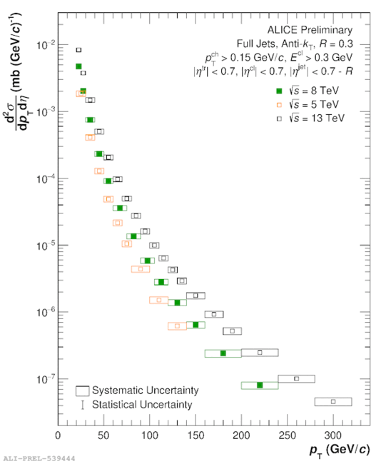 Statistical errors shown as vertical error bars, systematic errors shown as shaded boxes
