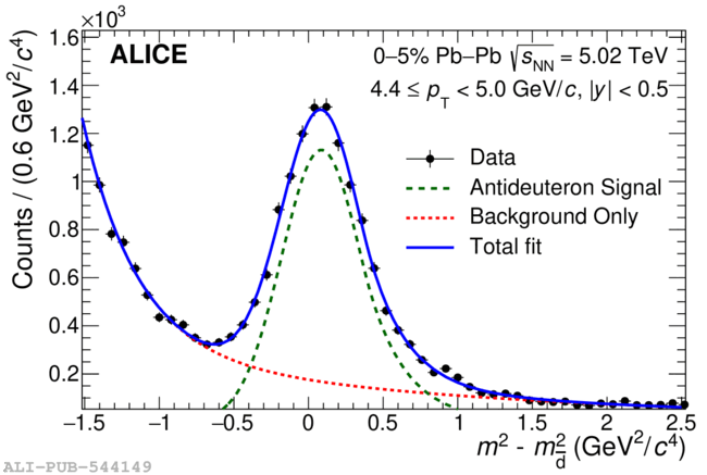 Fit to the measured squared mass to extract the antideuteron signal in 4.4 $$ \pt $$ 5.0 GeV/$c$ (left) and the antitriton signal in 2.0 $$ \pt $$ 2.4 GeV/$c$ (right). The red dashed line shows the background, the solid blue line the combined fit to the data and the green dashed line the signal only.