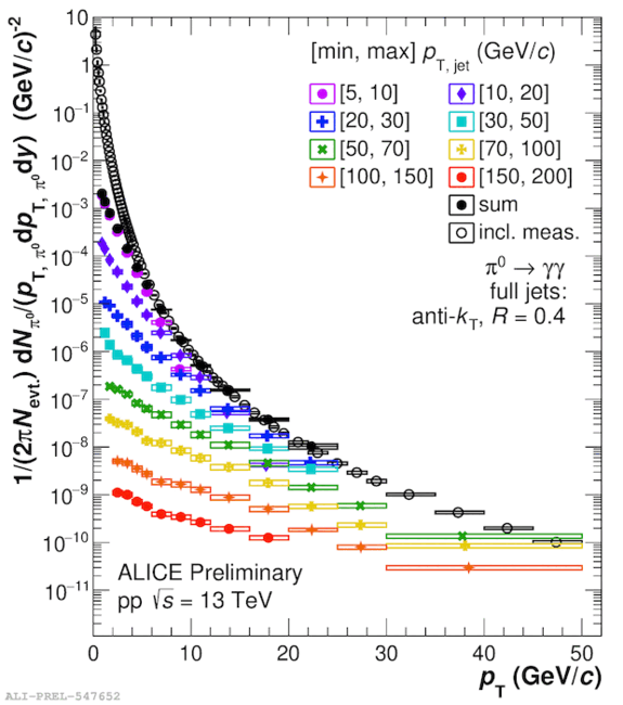 Pi0 pT spectra in different jet pT intervals normalized per event. The results are combined from results using the PCM, EMC and PCM-EMC Pi0 reconstruction technique. Also, the sum of the different jet-pT intervals as well as the inclusive Pi0 spectrum is shown.