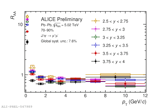 The J/psi nuclear modification factor for six y intervals at forward rapidity as a function of pT in the centrality range (70-90)% in Pb-Pb collisions at 5.02 TeV.