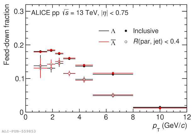 Fraction of $\lmb$ yield removed due to the subtraction of feed-down contributions from charged and neutral $\Xi$ baryons decays in pp collisions at \thirteen (left) and \pPb collisions at \fivenn (right) The vertical bars represent the statistical uncertainties.