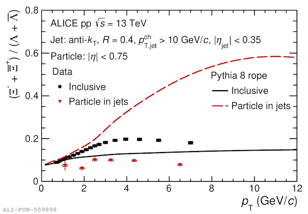 $\pT$-dependent $\Xi$/$\lmb$ (left panel) and $\Omega$/$\lmb$ (right panel) ratios in pp collisions at \thirteen For each case, the results of JE particles (red inverted-triangle) are compared with that of inclusive (black closed circles) The corresponding colour-rope predictions~ implemented in the \Pyeight event generator~ are compared to data as well.