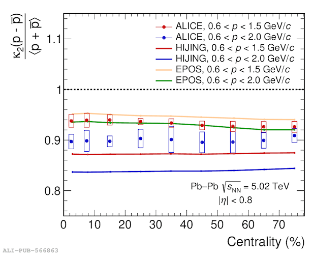 Centrality (left) and pseudorapidity interval (right) dependence of the normalized second-order cumulants of net protons for \mbox{$\snn = 5.02$~TeV} and two momentum intervals for the protons. The ALICE data are shown by red and blue markers for $0.6 p 1.5$~GeV/c and $0.6 p 2.0$~GeV/c, respectively. The colored shaded areas indicate the results from the HIJING~ and EPOS~ model calculations. In the right panel, in addition, the dashed colored lines represent the predictions from the model with local baryon number conservation with $\Delta y_{\rm corr}=5$~.