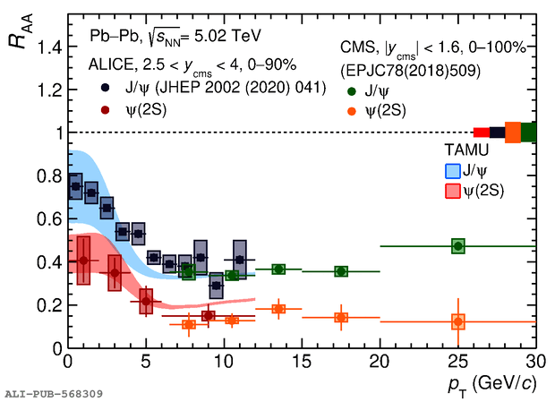 The $R_{\rm AA}$ for $\psi({\rm 2S})$ and J/$\psi$~ as a function of $p_{\rm T}$. Comparison with theory models and results from the CMS experiment~ are also shown.