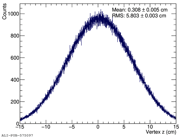 Longitudinal distribution of the primary vertex positions from ITS2 tracks reconstructed online during the LHC pilot beam in October 2021. ~.