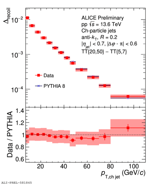 Delta recoil (background subtracted recoil jet yield) as a function of pT (red) with PYTHIA comparison (blue) for R=0.2 jets