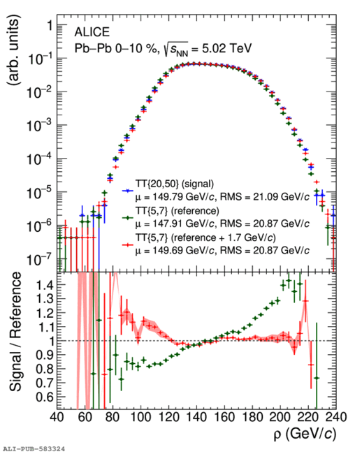 $\rho$ distributions for central \PbPb\ collisions at $\sqrtsNN=5.02$ TeV. Upper panel: \TTSig\ and \TTRef\ distributions, and the \TTRef\ distribution shifted by $\drho=1.7$ \gev\ (Sec.~\ref{sect:rhoaligngment}). Lower panel: ratio of \TTRef\ and shifted \TTRef\ to \TTSig\ distribution. The mean ($\mu$) and RMS of the distributions are given in the legend. The vertical lines on the data points are the statistical uncertainties, and the shaded band on the ratio of the \TTSig\ over the shifted \TTRef\ distributions represents the systematic uncertainty of the procedure.