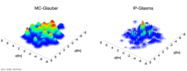 The $xy$ distributions of the initial energy density (arbitrary units) from the MC-Glauber and IP-Glasma models for a heavy-ion collision~.