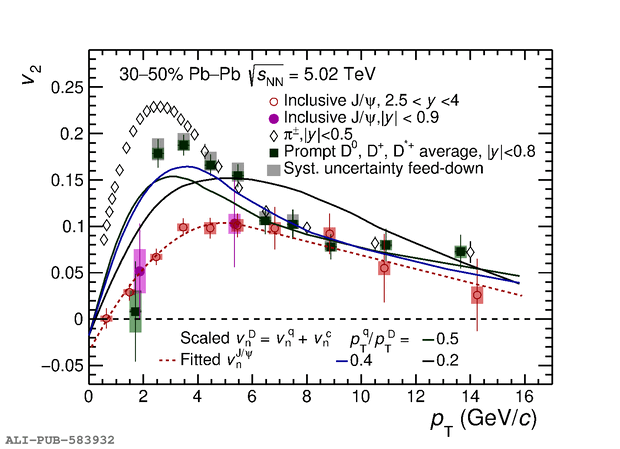 The $p_{\rm T}$ dependence of inclusive J/$\psi$ $v_{\rm 2}$~ compared with the corresponding results for prompt D mesons~ and charged pions~. The expected $v_{\rm 2}$ for open charm in the constituent quark approach, and for various values of the ratio $p_{\rm T}^{\rm q}/p_{\rm T}^{\rm D}$ are also shown.
