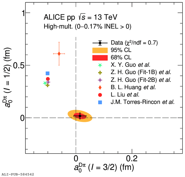 Scattering length of the \DPi (left) and \DstarPi (right) interaction, for the two isospin channels that characterize the systems. They are extracted from a simultaneous $\chi^2$ minimization to the experimental correlation functions. The red (orange) areas represent the resulting confidence intervals for a 68\% (95\%) probability. The dashed lines correspond to Coulomb interaction only, as the scattering lengths of the strong interaction vanish. As comparison, the available theoretical predictions~, listed in Tables~\ref{tab:scatParamPi} and~\ref{tab:scatParamK} are shown as well.