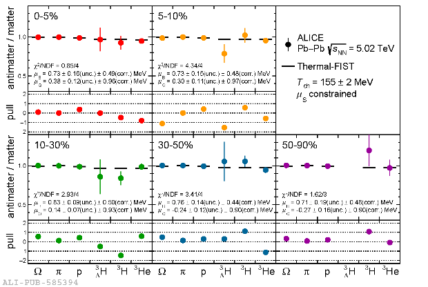 Upper panels: statistical hadronization model fits to the measured antiparticle-to-particle yield ratios in different centrality intervals. Error bars show the sum in quadrature of statistical and centrality-uncorrelated systematic uncertainties. When not visible, error bars are hidden by the marker. Lower panels: pull distribution, defined as the difference between data and fit values, normalized to the uncertainty in the data.