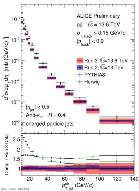 Comparisons with ALICE Run 2, PYTHIA8, and HERWIG are presented.