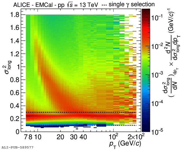 \small { (a) Cluster shower shape distribution \sigmalong\ as a function of the cluster \pt\ in data. The dashed lines correspond to the upper and lower selection limit values for single photon candidate clusters used in the analysis. (b) Projected shower shape distribution in two \pt\ intervals in data (black circles) and simulation (red crosses, PYTHIA~8 jet--jet and $\gamma$--jet events). For the simulation, the \sigmalong\ distribution for clusters with different particle origins are also shown as shaded areas except for prompt photons from $\gamma$--jet PYTHIA~8 processes that are presented with a blue histogram line. }.