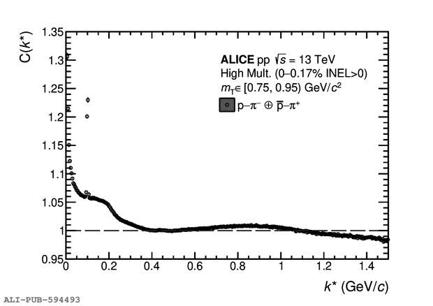The experimental correlation function of $\ppiMinus$ pairs as a function of the pair relative momentum $k^*$ in several intervals of the pair \mtText: (a) $[0.54, 0.75)\text{ GeV}/c^2$, (b) $[0.75, 0.95)\text{ GeV}/c^2$, (c) $[0.95, 1.2)\text{ GeV}/c^2$, (d) $[1.2, 1.5)\text{ GeV}/c^2$, (e) $[1.5, 2.0)\text{ GeV}/c^2$, and (f) $[2.0, 2.5)\text{ GeV}/c^2$. The lines show the statistical uncertainties of the experimental data, while the respective systematic uncertainties are represented by the boxes.