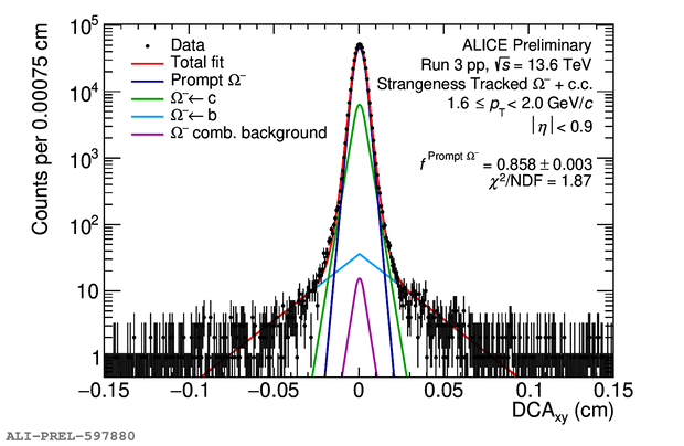 Example fit of the $\Omega^{-}$ DCA$_{xy}$ distribution (black dots) using the model obtained from Monte Carlo simulations (red line).